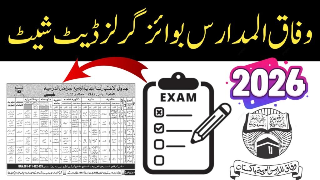 Wifaq ul Madaris Al Arabia Boys and Girls Annual Exam Date Sheet 2026 | وفاق المدارس للبنین و للبنات سالانہ امتحانات ڈیٹ شیٹ وفاق المدارس العربیہ پاکستان میں ایک ایسی تنظیم ہے جو مذہبی مدارس کی نگرانی اور تنظیم کرتی ہے۔ یہ اس بات کی ضمانت کے لیے قائم کیا گیا تھا کہ یہ مدارس […]