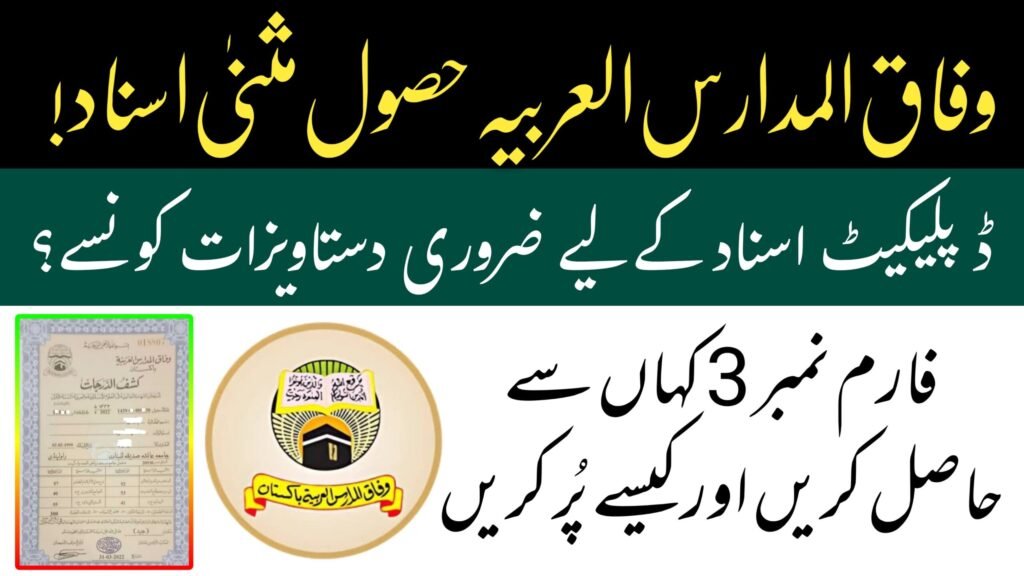 Wifaq ul Madaris Al-Arabia Pakistan How to Get Duplicate Certificates for Lost Asnad – Form No. 3 Step-by-Step | وفاق المدارس العربیہ پاکستان: گمشدہ سند (اسناد) کی مثنیٰ (ڈوپلیکیٹ) حاصل کرنے کا مکمل طریقہ کار – فارم نمبر 3 کے ساتھ مرحلہ وار رہنمائی