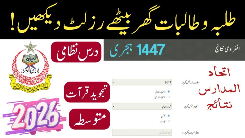 Ittehad Ul Madaris Al Arabia Pakistan Result 2026 Check Online By Roll No 1447 Hijri Exams | اتحاد المدارس العربیہ پاکستان نتائج 1447 للبنین اور للبنات رولنمبر اور نام کے ساتھ اتحاد المدارس العربیہ پاکستان پاکستان کے دینی مدارس کا ایک اہم تعلیمی و تنظیمی ادارہ ہے جس کا مرکزی دفتر ضلع مردان، خیبر پختونخوا […]
