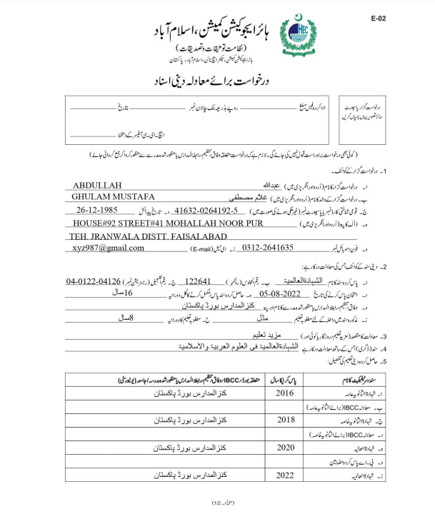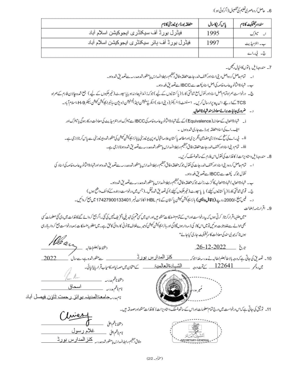 - Filling of an application form E-02 duly signed and verified by concerned Madaris Nazim-e-Ala for Deeni Asnad.