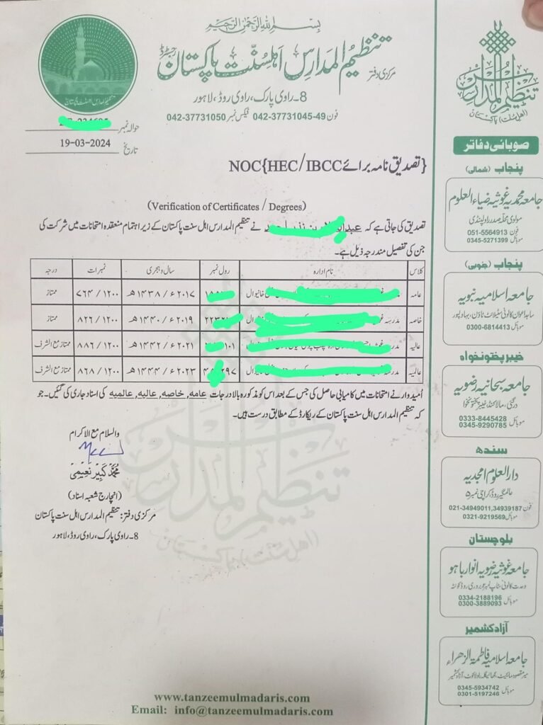 Students who graduate from Tanzeem ul Madaris can receive certificates from the Higher Education Commission (HEC) of Pakistan. These certificates show that they’ve finished their studies and can pursue further education or find jobs. Tanzeem ul Madaris teaches various subjects about Islam to help students understand it better. With these certificates, students can advance in their studies and careers. Tanzeem ul Madaris supports students in growing intellectually and spiritually.