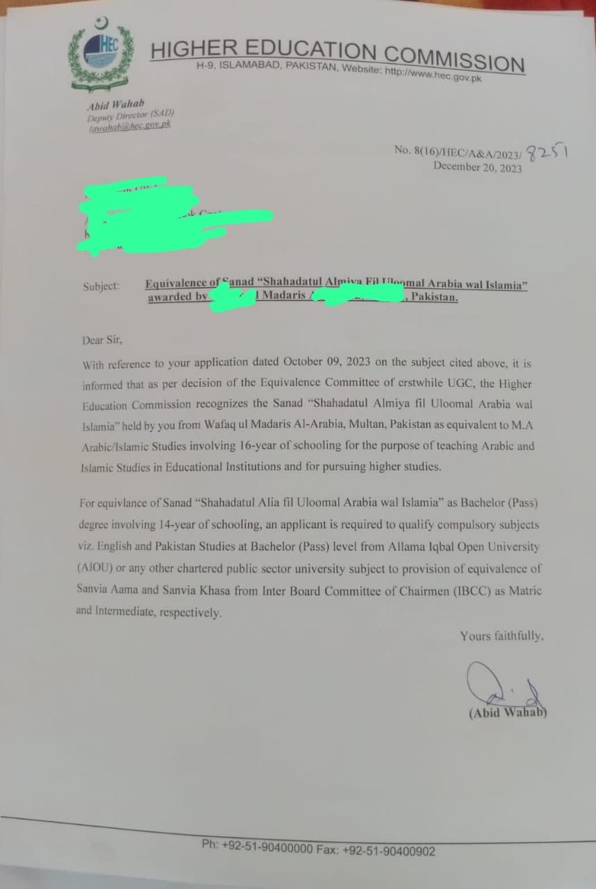 The Higher Education Commission (HEC) Equivalence Certificate recognizes the Dars-e-Nizami Shahadat ul Almiyah (equivalent to MA Arabic & Islamic Studies) from Kanzul Madaris Board as comparable to Pakistani university degrees. It is required for higher education admissions, government jobs, or further studies that demand formal degree recognition.
