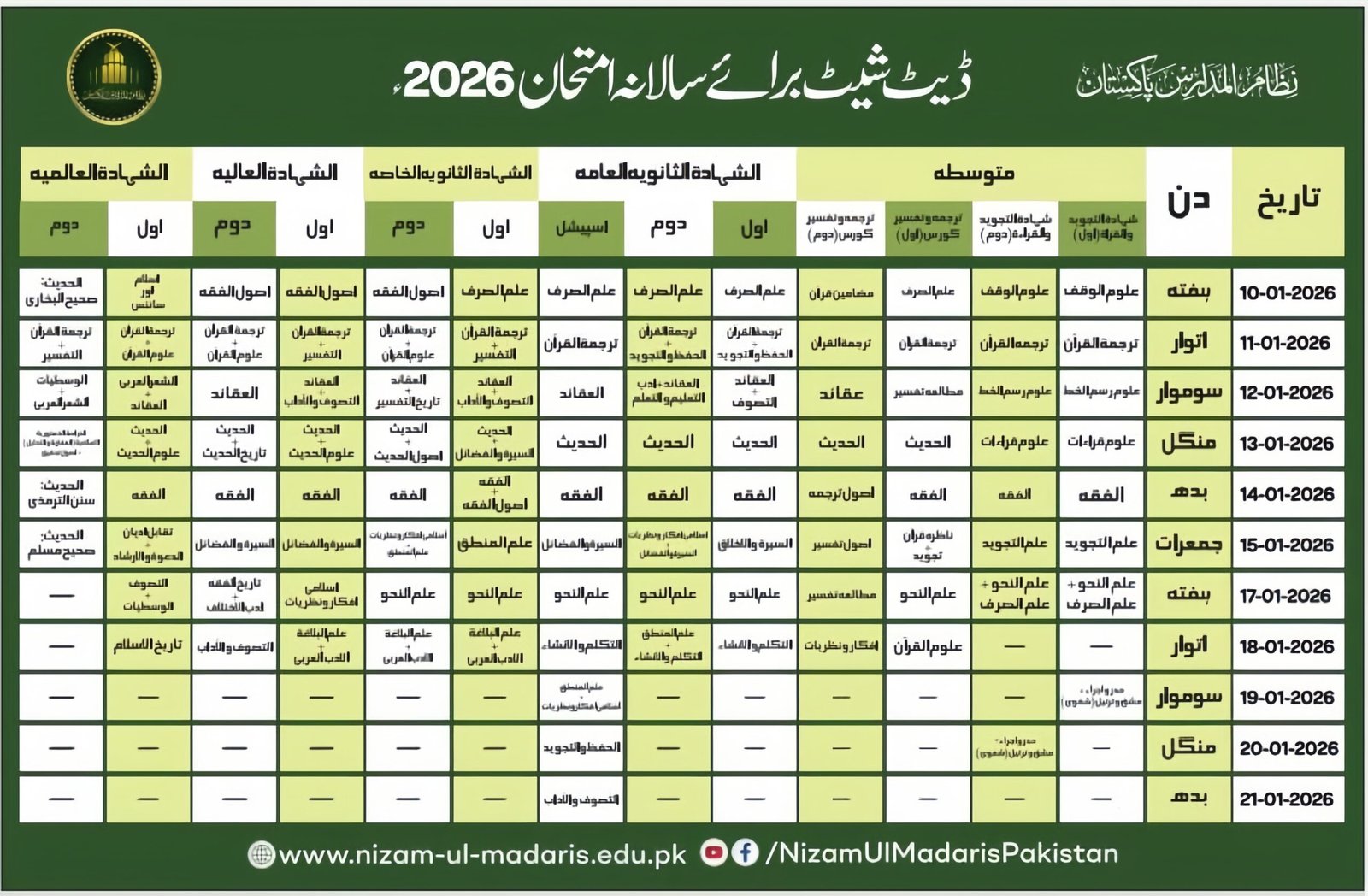 Nizam ul Madaris Exams for male and female students (boys and girls) were held from 10 January to 21 January 2026.