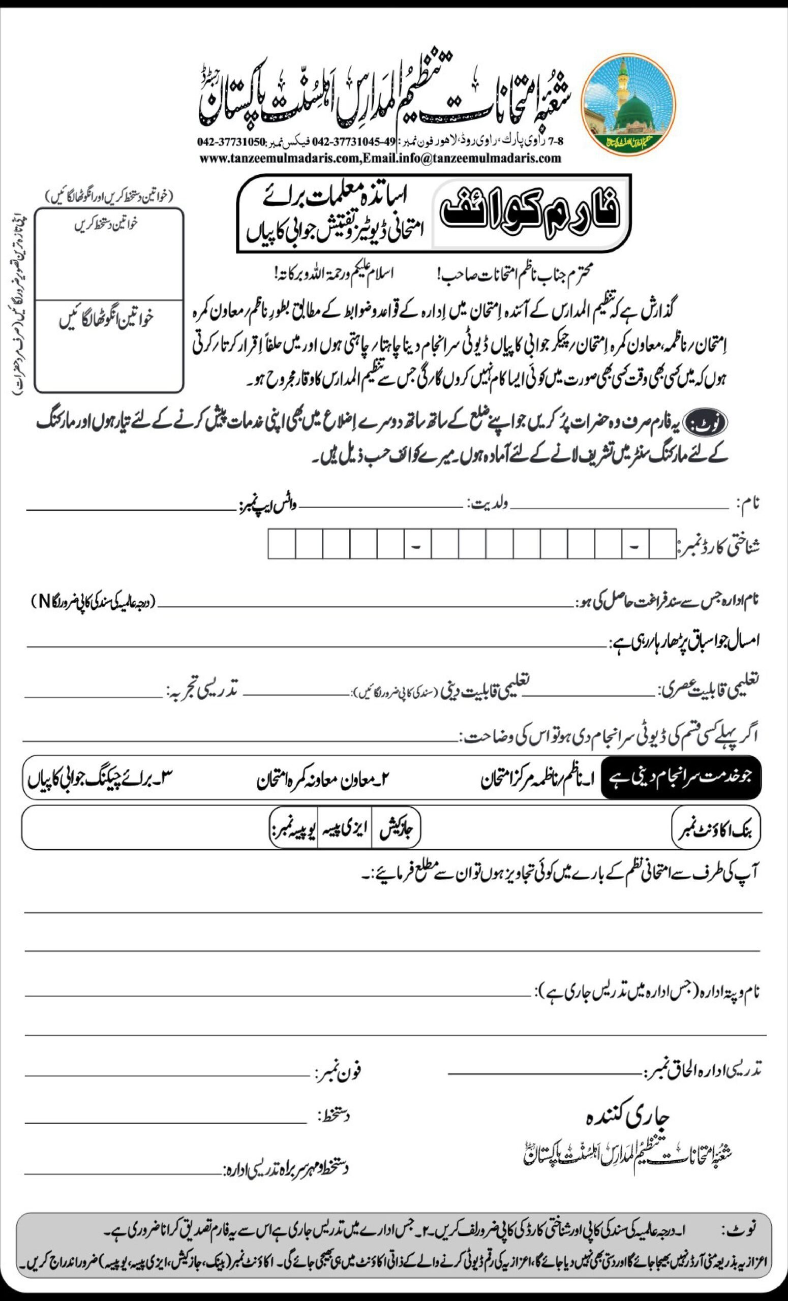Tanzeem ul Madaris Ahle Sunnat Pakistan Application Form for Examination Duty | تنظیم المدارس اہل سنت پاکستان کے امتحانی ڈیوٹی کے لیے درخواست فارم