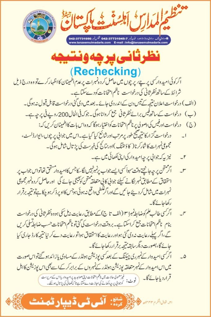 تنظیم المدارس کے سالانہ امتحانات 2026 کے رزلٹ کے حوالے سے اگر آپ کو یہ شک ہو کہ آپ کے نمبر غلط درج کیے گئے ہیں اور آپ اپنے پیپرز کی ری چیکنگ کرانا چاہتے ہیں، تو آپ کو تنظیم المدارس کی جانب سے فراہم کردہ درخواست فارم پر نظر ثانی کے لیے درخواست دینی ہوگی۔