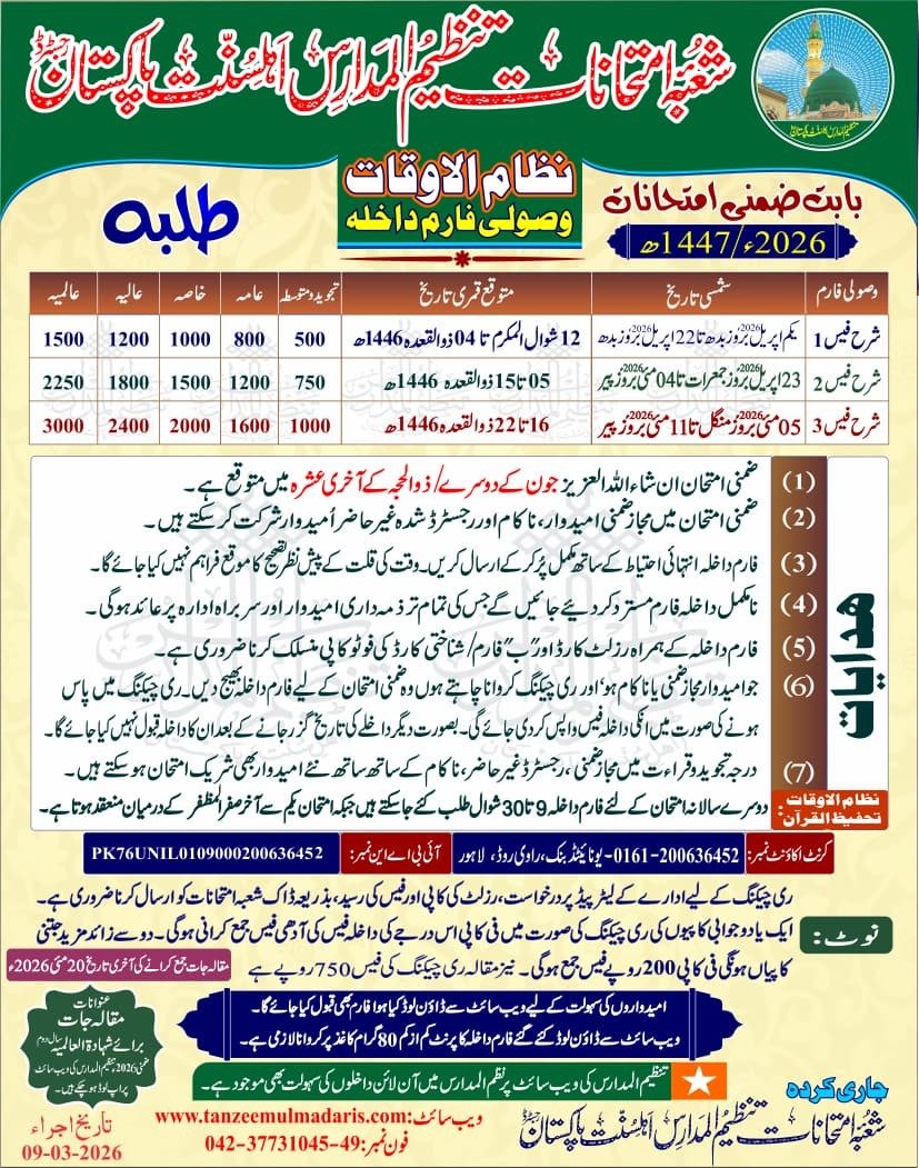 مشورہ دیا جاتا ہے کہ آپ تنظیم المدارس کے متعلقہ حکام سے براہ راست رابطہ کریں تاکہ آپ کو اس عمل کی مکمل رہنمائی اور تفصیلات مل سکیں۔ - نوٹ: