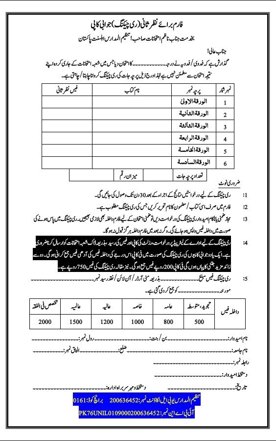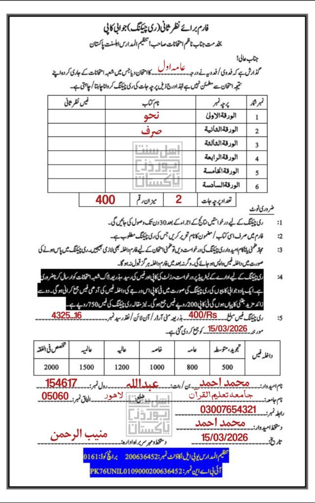 Tanzeem ul Madaris Rechecking Form (Nazr-e-Sani) 2026 | تنظیم المدارس درخواست فارم برائے نظر ثانی ری چیکنگ جوابی کاپی
