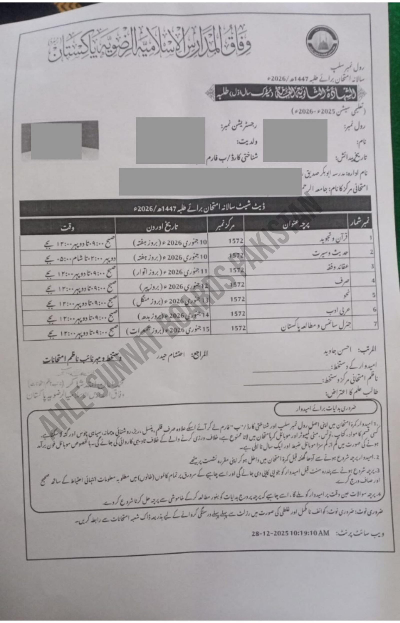 Roll number slips will be sent soon to the respective affiliated madaris and jamiaat under Wafaq ul Madaris al Islamia al Rizvia Pakistan. Students should contact their institutions promptly to collect them.