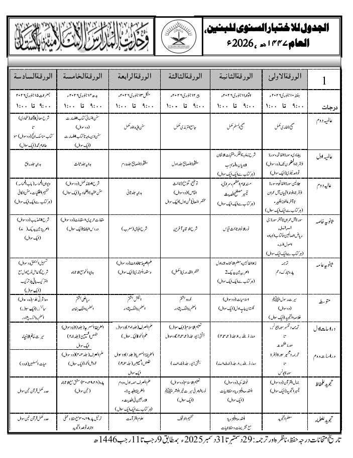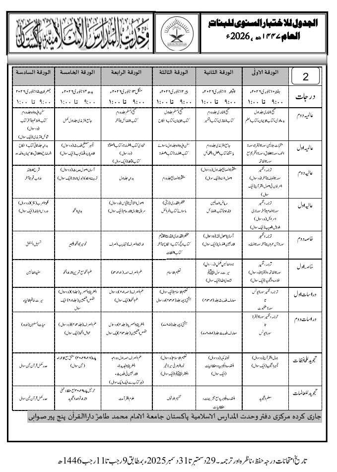 وحدت المدارس الاسلامیہ پاکستان کے للبنات (طالبات) کے سالانہ امتحانات 10 جنوری سے 15 جنوری 2026 تک منعقد ہوئے۔ ان امتحانات میں درسِ نظامی، تجوید للعالمات، تجوید للحافظات، دراساتِ دینیہ اور متوسطہ شامل تھے۔