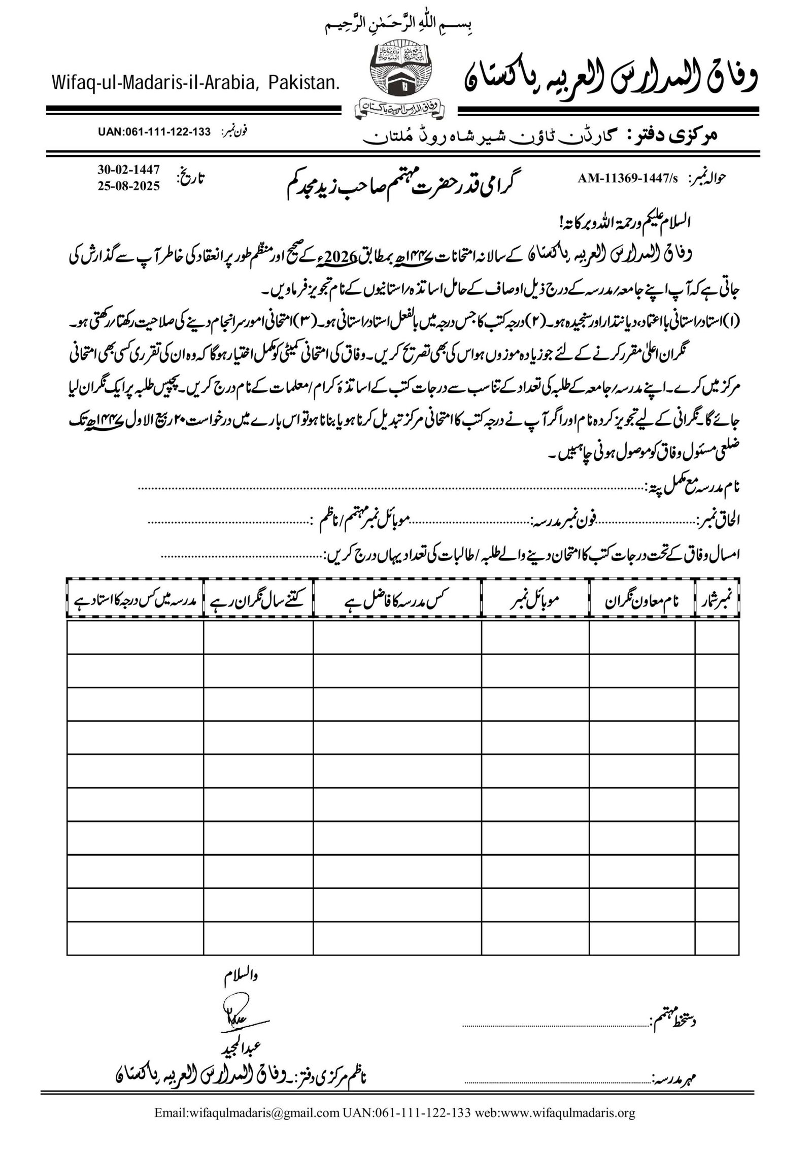 - مہتمم یا ناظم کا نام اور رابطہ نمبر